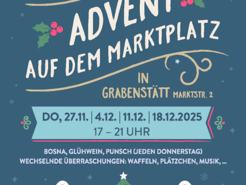 Fremdenverkehrsverein Grabenstätt e. V. und SK Confiserie & Weinbar "Am Platzl": Advent auf dem Marktplatz in Grabenstätt, Marktstraße 2. Es gibt immer Bosna, Glühwein und Punsch, außerdem gibt es wechselnde Überraschungen wie Waffeln, Plätzchen, Musik,...