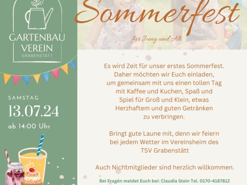 Es wird Zeit für unser erstes Sommerfest. Daher möchten wir Euch einladen, um gemeinsam mit uns einen tollen Tag mit Kaffee und Kuchen, Spaß und Spiel für Groß und Klein, etwas Herzhaftem und guten Getränken zu verbringen. Bringt gute Laune mit, denn wir feiern bei jedem Wetter im Vereinsheim des TSV Grabenstätt- Auch Nichtmitglieder sind herzlich willkommen. Bei Fragen meldet Euch bei Claudia Stein, Tel. 0170-4187812