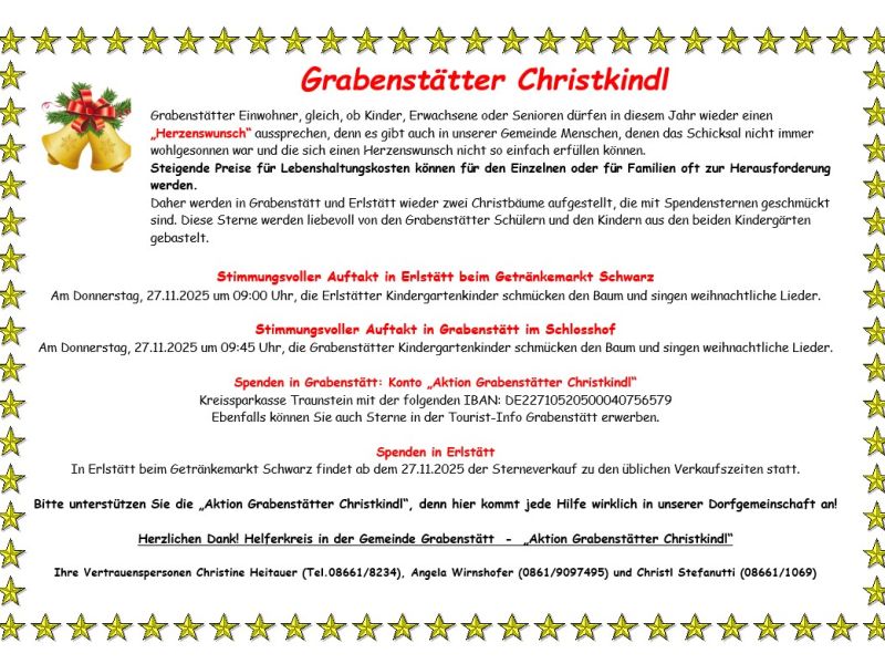Grabenstätter Einwohner, gleich, ob Kinder, Erwachsene oder Senioren dürfen in diesem Jahr wieder einen „Herzenswunsch“ aussprechen, denn es gibt auch in unserer Gemeinde Menschen, denen das Schicksal nicht immer wohlgesonnen war und die sich einen Herzenswunsch nicht so einfach erfüllen können. Steigende Preise für Lebenshaltungskosten können für den Einzelnen oder für Familien oft zur Herausforderung werden. Daher werden in Grabenstätt und Erlstätt wieder zwei Christbäume aufgestellt, die mit Spendensternen geschmückt sind. Diese Sterne werden liebevoll von den Grabenstätter Schülern und den Kindern aus den beiden Kindergärten gebastelt. Stimmungsvoller Auftakt in Erlstätt beim Getränkemarkt Schwarz Am Donnerstag, 27.11.2025 um 09:00 Uhr, die Erlstätter Kindergartenkinder schmücken den Baum und singen weihnachtliche Lieder. Stimmungsvoller Auftakt in Grabenstätt im Schlosshof Am Donnerstag, 27.11.2025 um 09:45 Uhr, die Grabenstätter Kindergartenkinder schmücken den Baum und singen weihnachtliche Lieder. Spenden in Grabenstätt: Konto „Aktion Grabenstätter Christkindl“ Kreissparkasse Traunstein mit der folgenden IBAN: DE22710520500040756579 Ebenfalls können Sie auch Sterne in der Tourist-Info Grabenstätt erwerben. Spenden in Erlstätt In Erlstätt beim Getränkemarkt Schwarz findet ab dem 27.11.2025 der Sterneverkauf zu den üblichen Verkaufszeiten statt. Bitte unterstützen Sie die „Aktion Grabenstätter Christkindl“, denn hier kommt jede Hilfe wirklich in unserer Dorfgemeinschaft an! Herzlichen Dank! Helferkreis in der Gemeinde Grabenstätt - Aktion Grabenstätter Christkindl“ Ihre Vertrauenspersonen Christine Heitauer (Tel.08661/8234), Angela Wirnshofer (0861/9097495) und Christl Stefanutti (08661/1069)