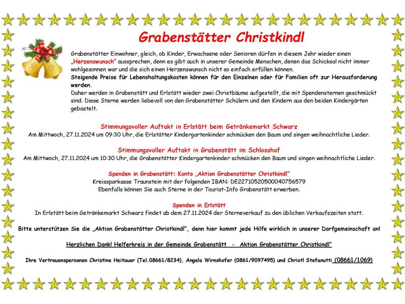 Grabenstätter Einwohner, gleich, ob Kinder, Erwachsene oder Senioren dürfen in diesem Jahr wieder einen „Herzenswunsch“ aussprechen, denn es gibt auch in unserer Gemeinde Menschen, denen das Schicksal nicht immer wohlgesonnen war und die sich einen Herzenswunsch nicht so einfach erfüllen können. Steigende Preise für Lebenshaltungskosten können für den Einzelnen oder für Familien oft zur Herausforderung werden. Daher werden in Grabenstätt und Erlstätt wieder zwei Christbäume aufgestellt, die mit Spendensternen geschmückt sind. Diese Sterne werden liebevoll von den Grabenstätter Schülern und den Kindern aus den beiden Kindergärten gebastelt. Stimmungsvoller Auftakt in Erlstätt beim Getränkemarkt Schwarz Am Donnerstag, 27.11.2025 um 09:00 Uhr, die Erlstätter Kindergartenkinder schmücken den Baum und singen weihnachtliche Lieder. Stimmungsvoller Auftakt in Grabenstätt im Schlosshof Am Donnerstag, 27.11.2025 um 09:45 Uhr, die Grabenstätter Kindergartenkinder schmücken den Baum und singen weihnachtliche Lieder. Spenden in Grabenstätt: Konto „Aktion Grabenstätter Christkindl“ Kreissparkasse Traunstein mit der folgenden IBAN: DE22710520500040756579 Ebenfalls können Sie auch Sterne in der Tourist-Info Grabenstätt erwerben. Spenden in Erlstätt In Erlstätt beim Getränkemarkt Schwarz findet ab dem 27.11.2025 der Sterneverkauf zu den üblichen Verkaufszeiten statt. Bitte unterstützen Sie die „Aktion Grabenstätter Christkindl“, denn hier kommt jede Hilfe wirklich in unserer Dorfgemeinschaft an! Herzlichen Dank! Helferkreis in der Gemeinde Grabenstätt - Aktion Grabenstätter Christkindl“ Ihre Vertrauenspersonen Christine Heitauer (Tel.08661/8234), Angela Wirnshofer (0861/9097495) und Christl Stefanutti (08661/1069)