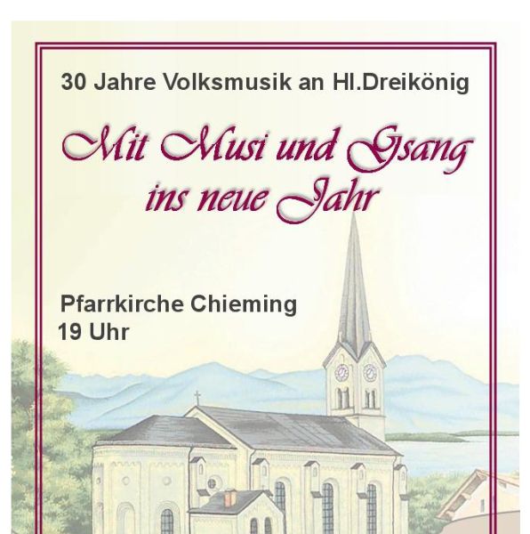 Alpenländische Volksmusik, Lieder und Gschichtn werden am Hl. Dreikönigstag zum 30jährigen Jubiläum in einem ganz besonderen Rahmen präsentiert. Seit 1996 findet in Chieming jedes Jahr ein Sänger- und Musikantentreffen um den Feiertag Heiligdreikönig statt. Die Organisatoren, die auch für die musikalische Zusammenstelung für "Aufgspuit am Chiemsee" zuständig sind, laden ein zu einem volksmusikalischen Abend am 06. Januar 2026 um 19:00 Uhr in der Pfarrkirche Chieming. Alle Infos unter: https://www.heimathaus-chieming.de