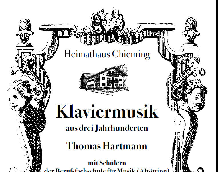 Am Samstag, 31. Januar, um 19:00 Uhr lädt das Heimathaus Chieming zu einem stimmungsvollen Klavierabend ein. Thomas Hartmann gestaltet das Konzert gemeinsam mit Schülerinnen und Schülern der Berufsfachschule für Musik in Altötting sowie Teilnehmerinnen und Teilnehmern von „Jugend musiziert“. Das Publikum erwartet ein abwechslungsreiches Programm mit klassischer Klaviermusik aus verschiedenen Epochen – von barocken und klassischen Werken bis hin zu romantischen Stücken. Die jungen Musikerinnen und Musiker präsentieren eine Auswahl solistischer Beiträge und zeigen dabei eindrucksvoll ihr musikalisches Können. Der Eintritt ist frei, um Spenden wird herzlich gebeten.