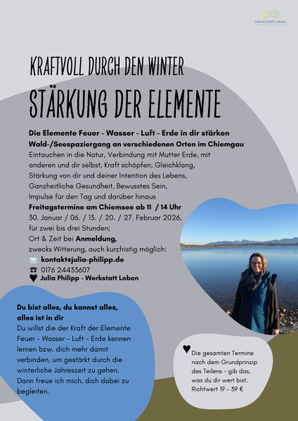 Julia Philipp lädt zu achtsam geführten Wald - & Seespaziergänge an verschiedenen Orten im Chiemgau ein. Die Verbindung mit sich, der Natur und den Elementen Feuer – Wasser – Luft – Erde stehen im Vordergrund. Die bewusste, ganzheitliche Stärkung deiner selbst. Die Termine an magischen Plätzen, mit traumhafter Kulisse direkt am Chiemsee sind ab dem 30. Januar 2026 und gehen aktuell bis 27. Februar 2026. Jeweils am Freitagvormittag / Nachmittag ab 11 bzw. 14 Uhr für zwei bis drei Stunden. Ausgangspunkt ist Stöttham, um einerseits in Richtung Seeon-Seebruck oder andererseits in Richtung Chieming aufzubrechen. Den genauen Treffpunkt bzw. mehr zur Uhrzeit gibt’s direkt bei der Anmeldung, gern auch kurzfristig bis zum Vorabend. Mail: kontakt@julia-philipp.de, Tel.: 0176 24433607 Kosten: Die gesamten Termine nach dem Grundprinzip des Teilens – du entscheidest, was du dir wert bist, Richtwert 19 – 39 €