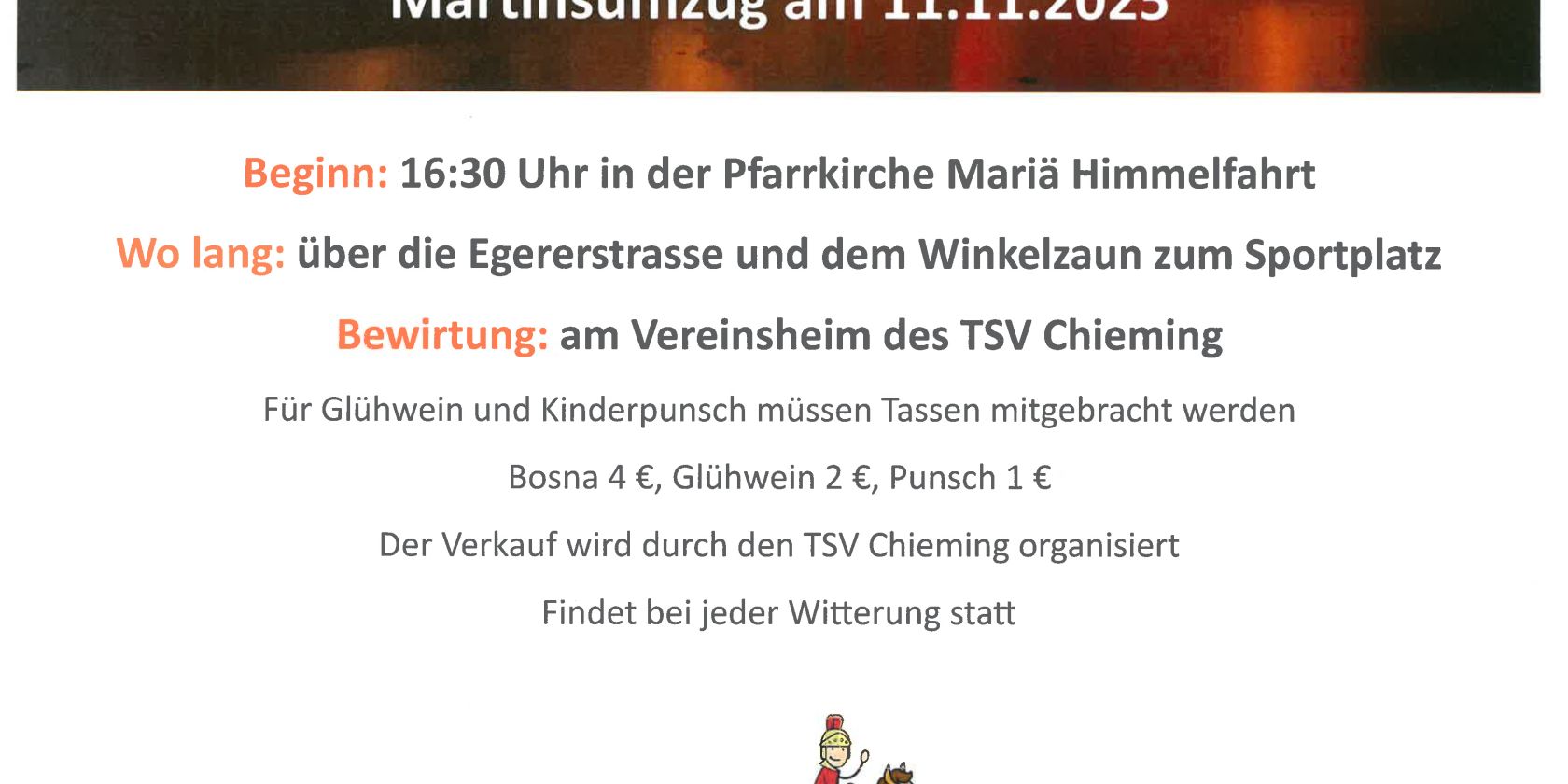 Herzliche Einladung zum Martinsfest in Chieming! Nach einer Einstimmung in der Pfarrkirche Mariä Himmelfahrt um 16:30 Uhr beginnt der Martinszug. Über die Egererstrasse und den Winkelzaun gehen wir gemeinsam zum Sportplatz. Dort findet um ca. 17:30 Uhr das Martinsspiel statt. Für Bewirtung ist am Vereinsheim des TSV Chieming mit Kinderpunsch, Glühwein, Wurstsemmeln, ... gesorgt - Tassen bitte mitbringen. Die Veranstaltung findet bei jeder Witterung statt.