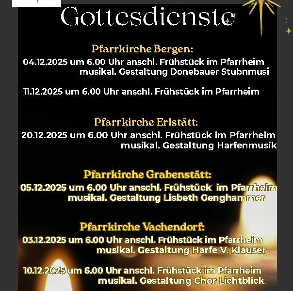 Pfarrverband Bergen/Erlstätt/Grabenstätt/Vachendorf: Rorate Gottesdienst Pfarrkirche Grabenstätt: 05.12.2025 um 06:00 Uhr mit anschließendem Frühstück im Pfarrheim Musikalische Gestaltung durch Lisbeth Genghammer