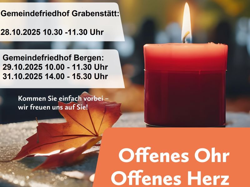 In den Tagen vor Allerheiligen besuchen viele Menschen die Friedhöfe, um die Gräber ihrer verstorbenen Angehörigen zu besuchen und zu schmücken. Die Erinnerung an die Verstorbenen und Trauer begleiten sie dabei. In manchen Friedhofsbesuchern bricht daher der Wunsch auf, mit jemandem zu reden. Die Seniorenseelsorge des Dekanates Traunstein und die Seelsorger:innen der Pfarreien möchten diesen Menschen auf den gemeindlichen Friedhöfen direkt vor Ort die Gelegenheit zu einem Gespräch und zur Begegnung bieten. Dieses Angebot steht zu den angegebenen Zeiten allen offen, unabhängig von ihrer Religionszugehörigkeit.