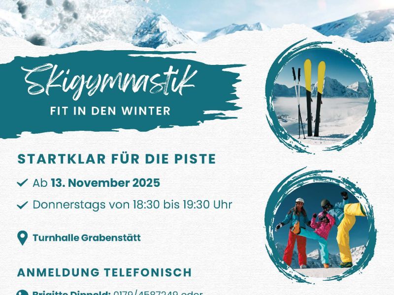 TSV Grabenstätt: Skigymnastik - Fit in den Winter Startklar für die Piste, ab 13.11.2025, immer donnerstags von 18:30 bis 19:30 Uhr in der Turnhalle in Grabenstätt Anmeldung telefonisch bei Brigitte Dippold: 0179/4587249 oder Steffi Kropf: 0176/41532159, eine nachträgliche Anmeldung ist möglich. Kosten für 10er Block: für Vereinsmitglieder 25,00 €, für Nichtmitglieder 60,00 €