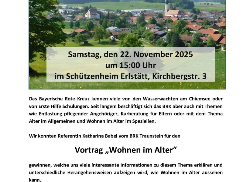 Einladung zum Vortrag "Wohnen im Alter". Das Bayerische Rote Kreuz kennen viele von den Wasserwachten am Chiemsee oder von Erste Hilfe Schulungen. Seit langem beschäftigt sich das BRK aber auch mit Themen wie Entlastung pflegender Angehöriger, Kurberatung für Eltern oder mit dem Thema Alter im Allgemeinen und Wohnen im Alter im Speziellen. Wir konnten Referentin Katharina Babel vom BRK Traunstein für den Vortrag "Wohnen im Alter" gewinnen, welche uns viele interessante Informationen zu diesem Thema erklären und unterschiedliche Herangehensweisen aufzeigen wird, wie wohnen im Alter aussehen kann. Von der Wohnberatung für barrierefreies Wohnen über Alltagsbegleitung gestaltet sich das Thema so individuell, wie die Personen selbst. Wir freuen uns auf zahlreiches Kommen und ein geselliges Beisammensein. Jeder, der sich interessiert, ist herzlich eingeladen! Euer VdK Ortsverband Erlstätt